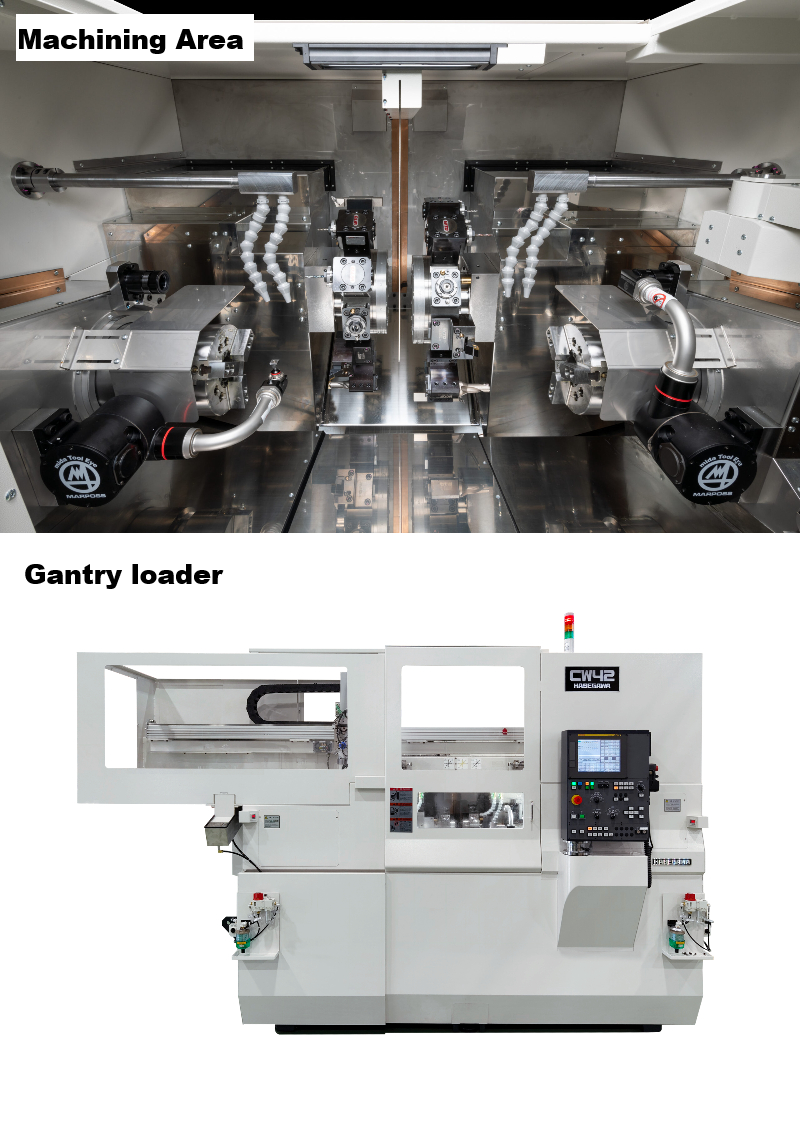 タレット型:Cシリーズ CW42/CW52 対向式2スピンドル2タレット(12角) 熱変位対策により高精度加工が可能 振動減衰性に優れた高剛性水平ベッド 同期加工及び 左右のワーク受け渡しが可能