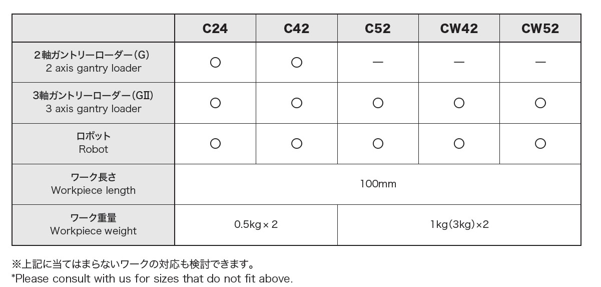 Hasegawa loaders use FANUC NC control and a gantry structure directly mounted to the machine’s cast-iron frame, ensuring high rigidity and stable operation. Models support workpieces from 500 g up to 3 kg, allowing selection according to production scale and application. On twin-spindle machines, front and back machining or simultaneous operations can be performed, contributing to shorter cycle times and process integration. Combined with the loader, unmanned operation and long-term automated running become easy, supporting night shifts and labor savings. Flexible customization such as dedicated grippers, part flipping units, stockers, and in-line measurement systems is also available for mass production.